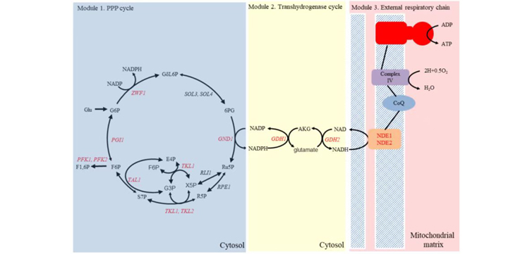 科研团队将看似无关的三个模块通过合成生物学的理念整合在一起,进而实现了这一目标。在该研究中,团队通过理性设计,组合了磷酸戊糖循环、转氢循环和外部呼吸链三个模块,在酵母细胞内构建了一个人工的合成能量系统。首先,科研团队初步验证了其构建的合成能量系统的碳流通量;然后证实该系统可以在细胞质中积累过量的NADPH和NADH,支持细胞合成高还原性化学品琥珀酸与甘油等产物的合成。最后,科研团队验证了该合成的能量系统可以代替线粒体中的TCA循环发挥作用,支持细胞生长。