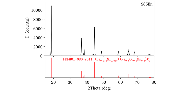 这一结论,由X射线衍射仪(简称XRD)给出,它通过X射线在材料晶层间的衍射,来了解样品的物相结构。图7中的测试结果显示样品与镍酸锂的晶体结构类似,具有α-NaFeO2型层状结构(R-3m空间群),再结合EDX所给出的元素比例,可以确定这款正极材料为811系的高镍三元正极材料(811指的是镍、钴、锰三种元素的比例)。其实2022年是超高镍元年,市场上很多材料中镍的占比更高于它。