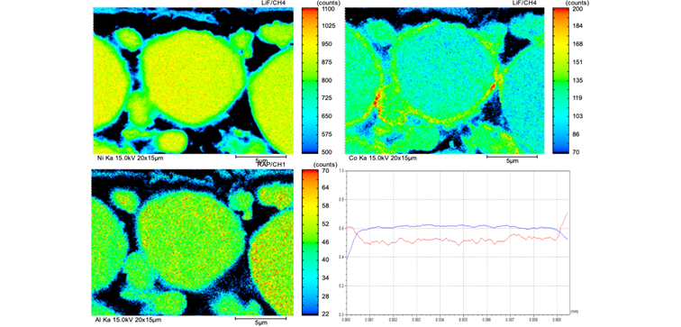 对单颗粒的面分布分析显示,颗粒中心镍含量高,边缘镍含量低,是一种呈浓度梯度的三元材料。掺杂的Al元素在大束流的照射下也清晰地显现,均匀的掺杂效果预示着这是一颗高质量正极材料。