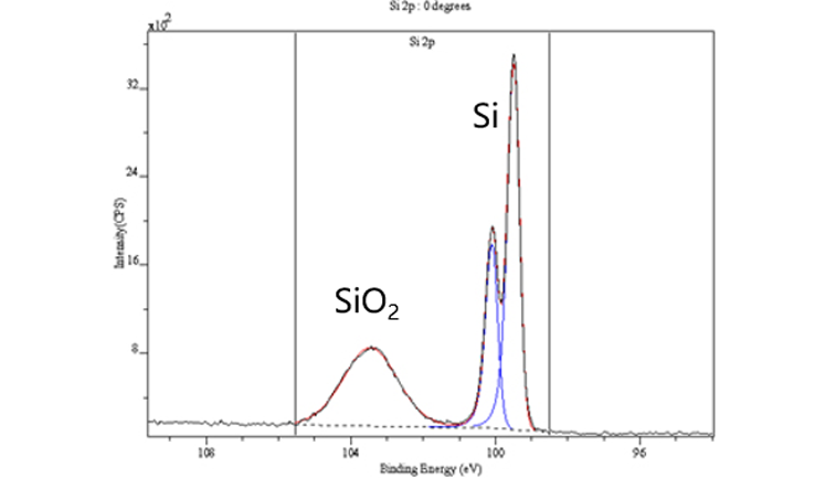 下图所示为硅片表面被氧化的Si的精细谱图,可以根据SiO2和Si的峰强度,计算氧化程度。