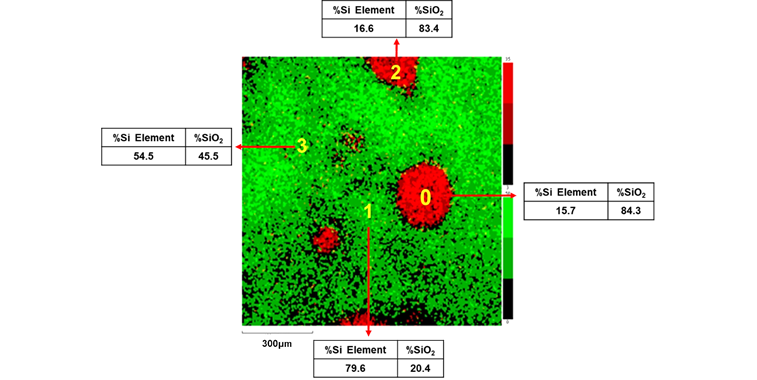 图2. 硅片表面分布岛状SiO2的XPS成像,Si(绿色)、SiO2(红色)
