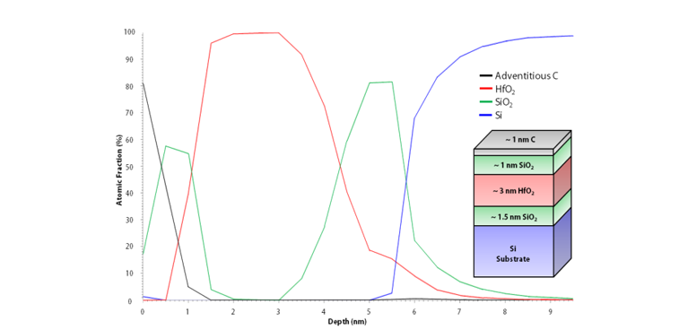 半导体业界常利用高K介电常数介质材料HfO2来代替传统SiON来改善栅极漏电流问题。使用XPS角分辨功能,对HfO2栅极氧化物多层结构进行分析可获得栅极氧化物的结构及厚度。