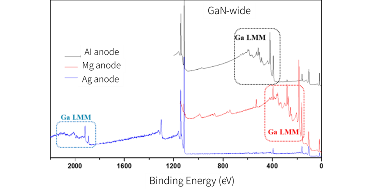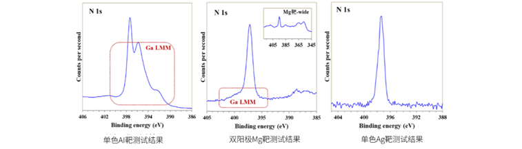 GaN可作为蓝绿光半导体材料,XPS分析该材料时,要注意Ga的俄歇峰对N 1s峰的干扰,单色Al靶测试时,Ga LMM对N 1s的干扰最为严重;双阳极Mg靶测试时,该干扰并不能完全消除;使用岛津高能Ag靶测试时,则可以得到完全分离的N 1s结果。