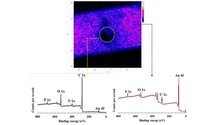 使用XPS快速平行成像结合小束斑采谱分析,由测试得到的全谱结果可知,两个区域均存在一定量的F元素;在图像中较亮区域测得结果中,Au元素为主要存在元素,表面C、O元素较少,而缺陷部位测试结果中则只具有少量的Au 4f信号,而C、O、N元素峰较为显著,推测该缺陷部位存在一定的有机物污染。