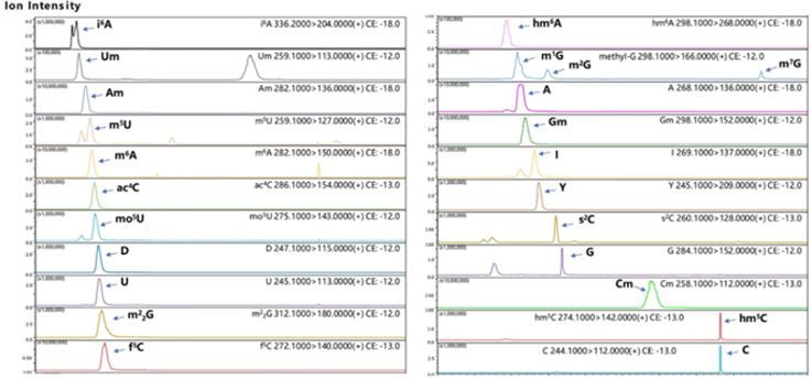 ●利用岛津微流量液相质谱联用系统测试了总tRNA组分中24个核苷标样,确定了各个标样所用的母离子和子离子,以及在HILIC色谱柱中的保留时间。通过多反应监测及保留时间,可以区分这些修饰核苷及其同分异构体。