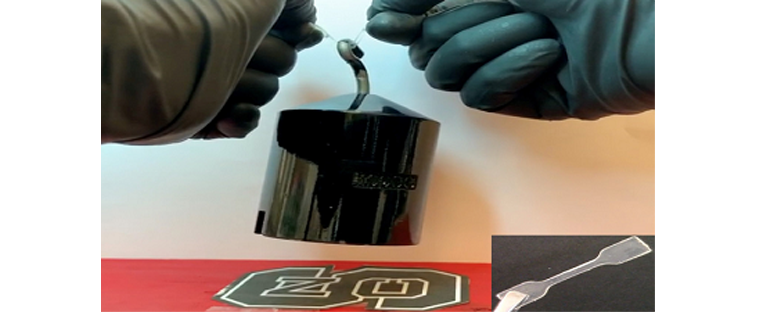 研究人员创造了一种可拉伸且非常坚韧的材料。该材料是一种离子凝胶,含有在室温下呈液态的盐。新材料具有聚丙烯酸的拉伸性,却比聚丙烯酰胺更强硬。就韧性而言,它比软骨还要好。图片来源:卡罗来纳州立大学