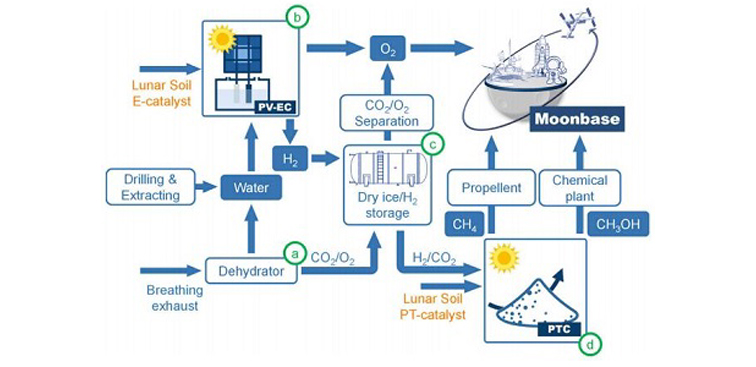 他所做的研究,是利用月球土壤中的一些成分作为人工光合成催化剂,把人类呼出的二氧化碳、月球表面开采的水等,制造成氧气、氢气、甲烷以及甲醇。