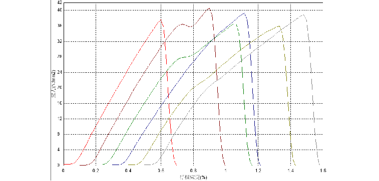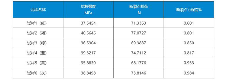从上图可知,试验机获取了客户所需的应力曲线,通过观察,6个试样的应力-应变曲线形态相似,从而判断碳纸拉伸性能比较均一。结合表中数据可知,最大应力分布在36~40MPa的区间内,拉伸强度的离散型也保持较好。