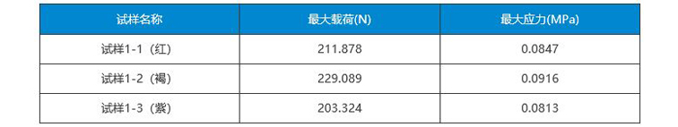 如上图可知,根据岛津AGS-X电子万能试验机获取的压缩测试载荷-行程曲线,观察3个试样的测试曲线形态相似,从表中数据可知,最大应力分布在0.008-0.009MPa的区间内,数值稳定,说明三个碳纸试样的抗压性相似。