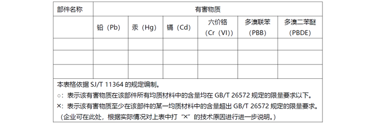环保安全性则要符合中国RoHS法规的要求。特别是2019年7月22日起,除医疗设备和监控工具外的电子电器还必须满足相应的限量要求才能进入欧盟市场。产品上还需要有标识并加以说明。如下表所示: