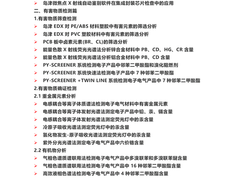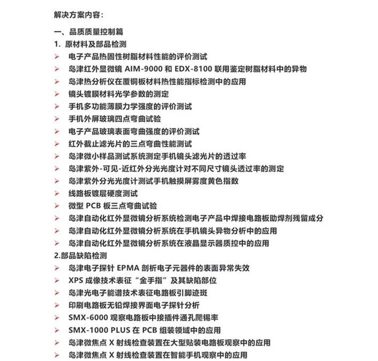 产品性能指标需要按照相关技术标准进行检测,当发现产品的某项性能未能达到设计标准,则应对造成该问题的原因进行排查,借此,提高和确保产品品质质量。如LED屏幕显示出现花屏或黑白点,可借助红外显微镜对显示屏进行分析,确认异物成分;电子元器件变色失效可通过电子探针EPMA剖析,然后提出解决办法并加以改进。