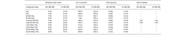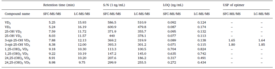 表3 比较SFC-MS/MS和LC-MS/MS法对VD代谢物的保留时间、信噪比(S/N)、定量限(LOQ)和峰分离度(USP)的影响。