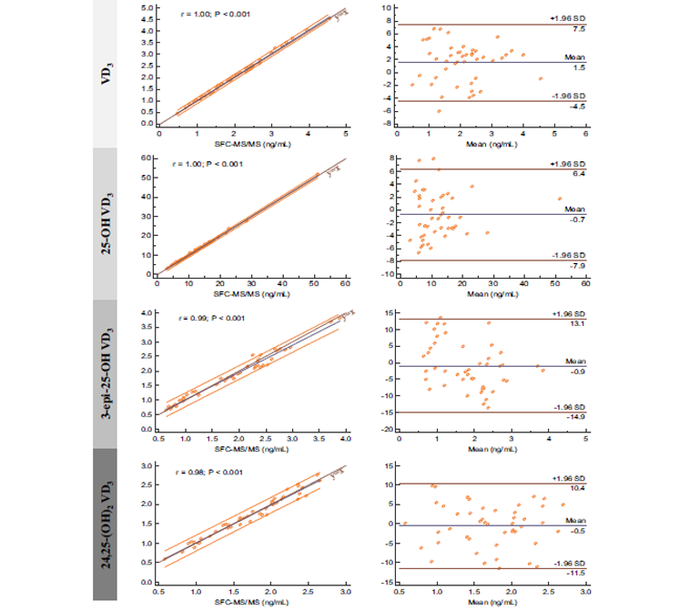图1. SFC-MS/MS和LC-MS/MS方法的回归分析和Bland-Altman