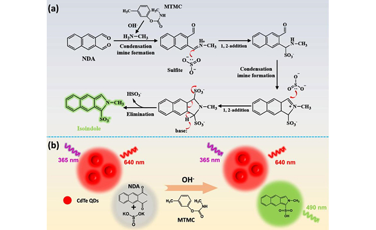 鉴于此,研究人员基于2, 3-萘二醛(NDA)和亚硫酸盐诱发的类?Strecker?反应原理,构建了一种无酶比率荧光探针,以?CdTe?量子点?(CdTe QD)?作为背景荧光,用于氨基甲酸酯农药(CPs)的全谱视觉识别。CPs加入后,通过亲核缩合反应产生绿色荧光的异吲哚,该荧光探针出现了从红色到绿色的明显颜色变化,实现对氨基甲酸酯的快速可视化响应,检测限(LOD)低至18.6 nM,远低于国家最大残留标准。?