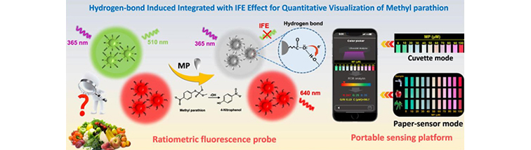 此外,通过集成绿色碳点和CdTe量子点(CdTe QD)构建了比率荧光探针,用于甲基对硫磷(MP)的高选择性定量检测。在碱性条件下,MP能迅速水解生成对硝基苯酚(p-NP),?氢键加强的瞬时反应导致碳点和p-NP之间的内滤效应猝灭绿色荧光,从而导致探针产生由绿到红的灵敏荧光色度变化,检测限低至为8.9 nM。?