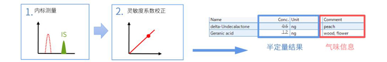 数据库中所包含的化合物都登记有气味感官信息,同时也登记了每个化合物的灵敏度系数和保留指数,因此可以通过测量灵敏度校正物质计算出被检测化合物的半定量浓度。利用这一信息,可以从检测到的化合物中分析产生香气的化合物。