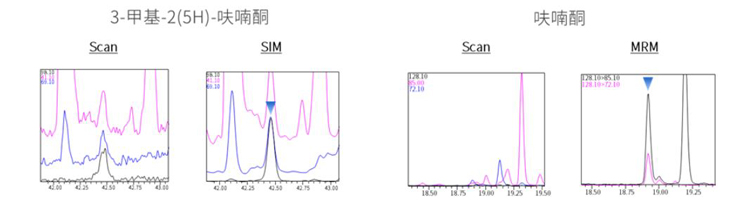 利用香味数据库可自动创建MRM和SIM的测量方法和数据分析方法。通常Scan方法分析的灵敏度可能无法满足香味物质检测需求,MRM和SIM方法则可以快速实现高灵敏度的目标分析,尤其是样品中有杂质干扰时MRM方法能够实现高精度分析,消除杂质影响。