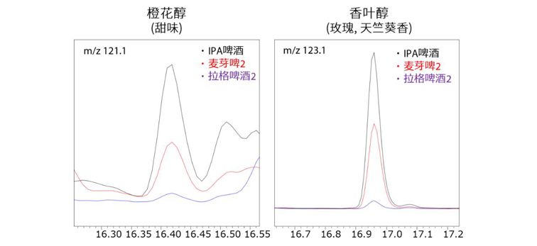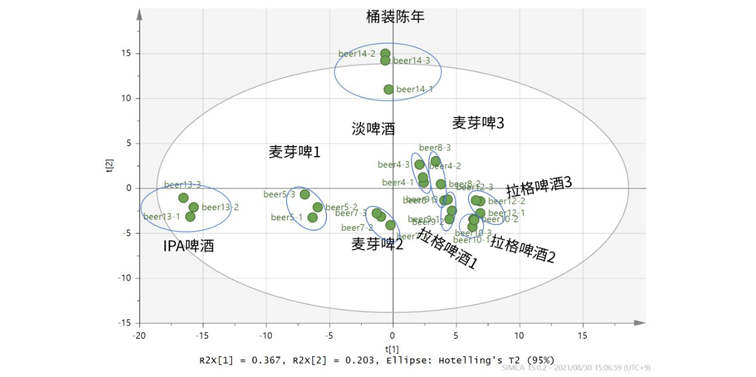 利用 Smart Aroma Database对商业啤酒样品进行分析,鉴定其香味成分,通过多元分析的结果证实啤酒之间的差异。