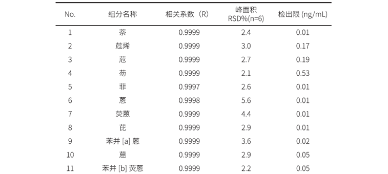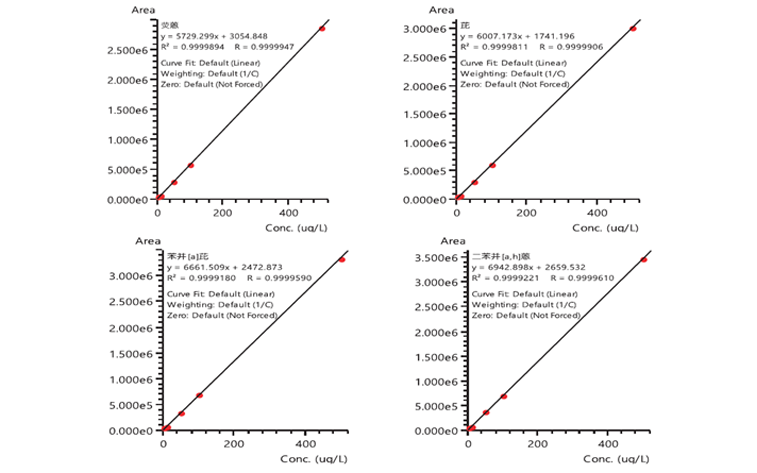 标准曲线浓度5、10、50、100、500μg/L的多环芳烃混合标准溶液,进样分析,得到标准曲线: