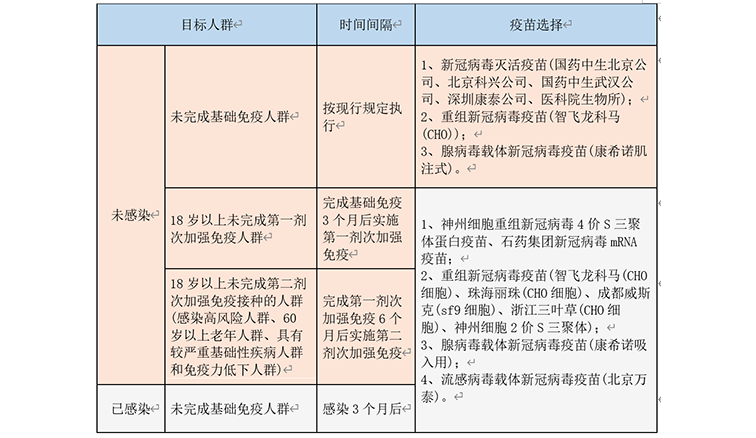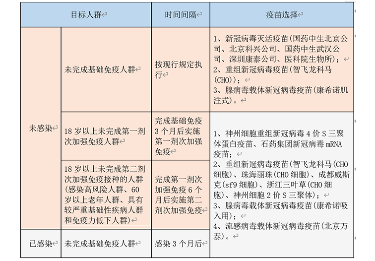 2023年4月,国务院应对新型冠状病毒感染疫情联防联控机制综合组下发《应对近期新冠病毒感染疫情疫苗接种工作方案》,对疫苗接种的目标人群、时间间隔、疫苗选择等也做出新的安排说明如下。