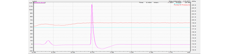 图中等度条件下,测试空白在0.75分钟出现一个鬼峰,鬼峰保留时间很稳定,压力波动在0.1~0.2 MPa之间,测试压力比以前正常值偏低2MPa。