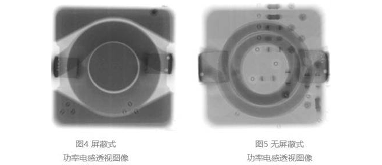图4是屏蔽式功率电感的透视图像,图5是无屏蔽式功率电感的透视图像。屏蔽式电感在线圈周围有空间,可以看到左右都是开放的。这是为了确保预留调节所需狭缝。无屏蔽式功率电感由于线圈周围的磁性树脂起到狭缝的作用,因此不需要预留狭缝结构。因此,无屏蔽式更易于小型化,而且磁性树脂封装不受振动和湿度的影响。然而,对无屏蔽式结构的电感,当其受到来自外部的压力超过耐受值时,树脂封装可能破裂。