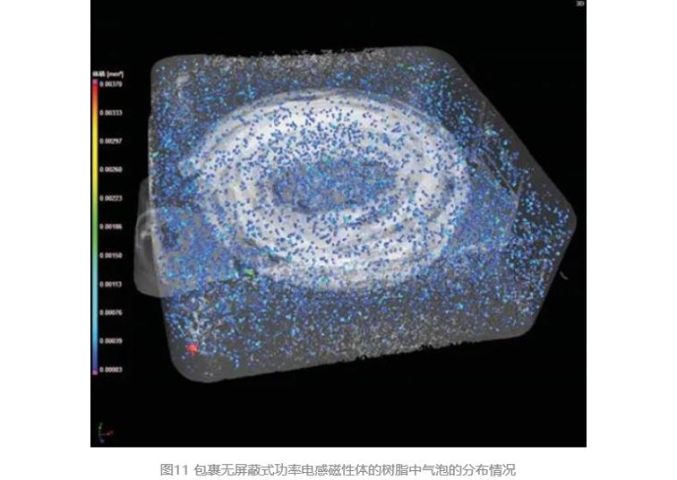 通过使用VGSTUDIO MAX的可选功能,可以可视化磁性树脂中的气泡(空隙),并量化位置和体积(图11)。除了确认气泡产生的情况外,还可以通过各种数字化信息确定缺陷产生的情况,并通过改变磁性树脂的配方和填充条件,提高制造效率,比如提高产量。
