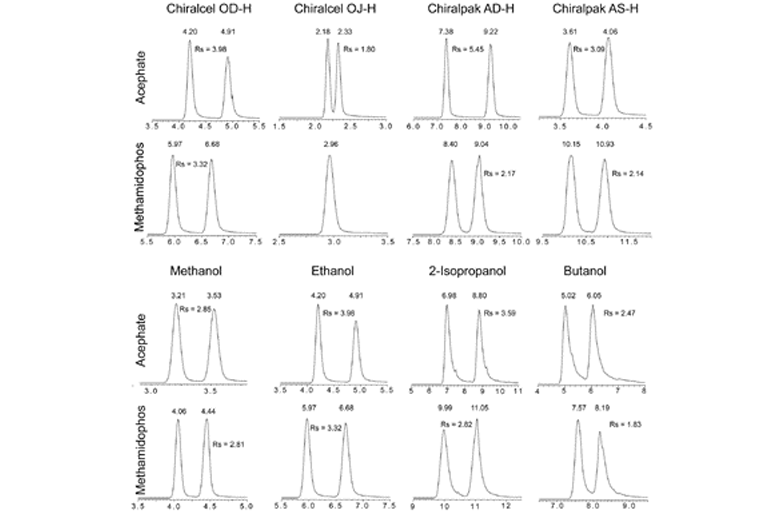 乙酰甲胺磷是一种广谱有机磷杀虫剂,在作物中可通过酰胺水解转化为毒性更大的代谢物甲胺磷。乙酰甲胺磷和甲胺磷均由一对对映体组成,虽然不同对映体的理化性质相同,但在活性、毒性和降解行为方面存在显著差异。因此,开发高效的乙酰甲胺磷及其代谢物甲胺磷对映体的分离和测定方法,并开展对映体选择性研究对乙酰甲胺磷及其代谢物的评估具有重要意义。目前手性分离主要采用手性色谱柱结合HPLC、GC、GC-MS/MS和LC-MS/MS进行,但对于部分手性农药存在分析时间长、分离度差等问题。