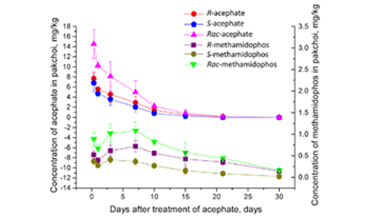 图2 R-乙酰甲胺磷、S-乙酰甲胺磷和Rac-乙酰甲胺磷(外消旋乙酰甲胺磷)及其代谢产物R-甲胺磷、S-甲胺磷和Rac-甲胺磷的残留量