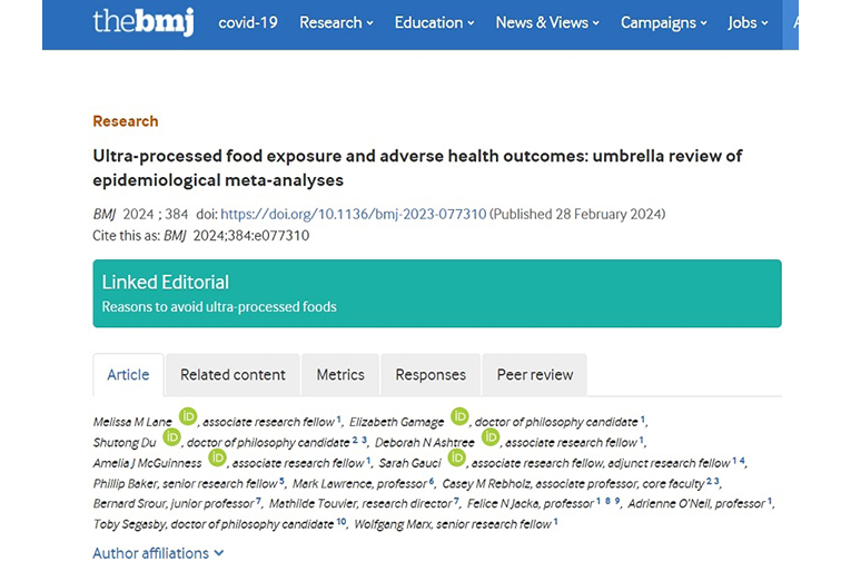 《英国医学杂志》2月28日发表的一项研究结果显示,吃过多的超加工食品可能对多个身体系统有害。许多证据一致表明,与超加工食品密切相关的健康隐患竟多达32种,包括癌症、重大心肺疾病、精神健康障碍和过早死亡。