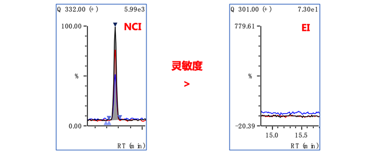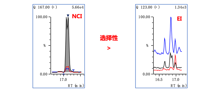 与最常用的EI(电子轰击电离)相比,NCI(负化学电离)是一种对含有–X(X为卤族元素)、-OR、-O-、=S、-P=O等电负性基团的化合物具有更高灵敏度(如图a示例)和更好选择性(如图b示例)的离子化方式。