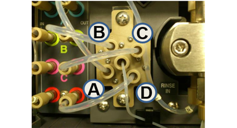 低压比例阀的4个电磁阀两个位于不同的水平高度,A&D 用于水相(高密度)在低水平位置,其中D推荐纯水;B&C 用于有机相(低密度)在高水平位置,流路中缓冲盐如果析出,由于重力下沉,被D路和A路中的水溶解。从而解决缓冲盐晶体进入流路的问题。