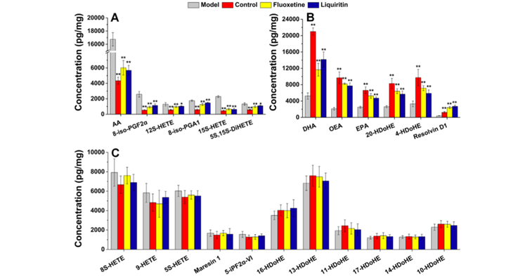 周婷副教授等人利用岛津在线超临界流体萃取-超临界流体色谱串联三重四级杆质谱仪进行了抑郁症大鼠脑组织中23种炎症相关脂质的定量分析。模型组中有6种炎症相关脂质均显著高于对照组(p < 0.01)*,包括AA及其衍生物。慢性应激会引起炎症失调,过量促炎细胞因子会使磷酸酶A2上调,从而导致AA水平升高。随后,AA通过脂氧合酶合成促炎脂质。经药物治疗后,相比于模型组,6种促炎脂质水平在氟西汀组和甘草苷组显著下调(p < 0.05),推测促炎脂质水平上调与抑郁症发生有关,而本研究中使用的氟西汀和甘草苷均可抑制促炎脂质水平上调。