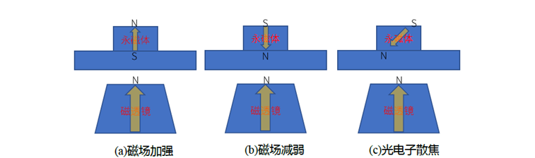 (c) 永磁体的杂散磁场将导致光电子的运动轨迹发生偏转,散焦