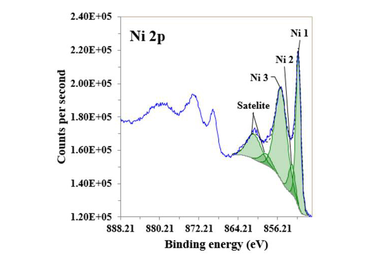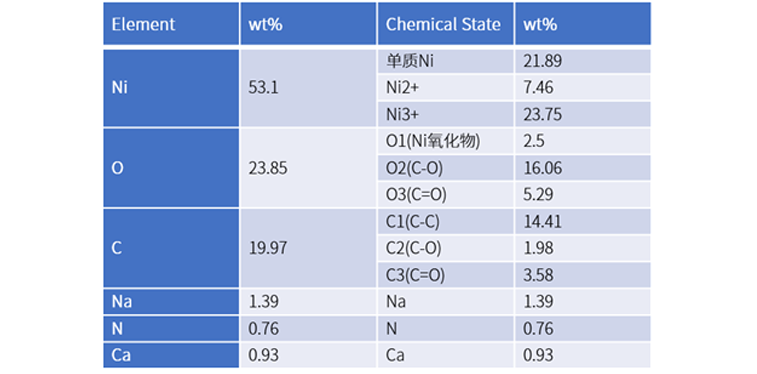 在磁透镜模式下,对上述样品进行全谱和各元素的精细谱分析,可以得到粉末样中主要含有Ni、O、C元素,还含有少量N、Ca、Na等元素。,Ni元素主要由单质Ni(Ni1,852.01 eV)和Ni2O3(Ni3,861.05 eV)组成,此外还含有少量二价Ni成分(Ni2,855.56 eV)。