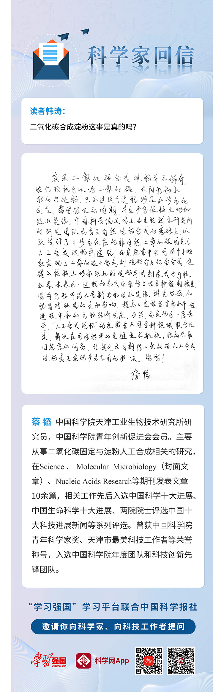 日前,“学习强国”学习平台与中国科学报社联合发起“科学家回信”活动,邀请广大读者向自己心中向往尊敬的科学家、科技工作者提问、留言。活动启动后,“学习强国”“科学网App”收到了读者的踊跃留言。我们精选了读者韩涛的提问,请中国科学院天津工业生物技术研究所研究员蔡韬发出第十期回信。
