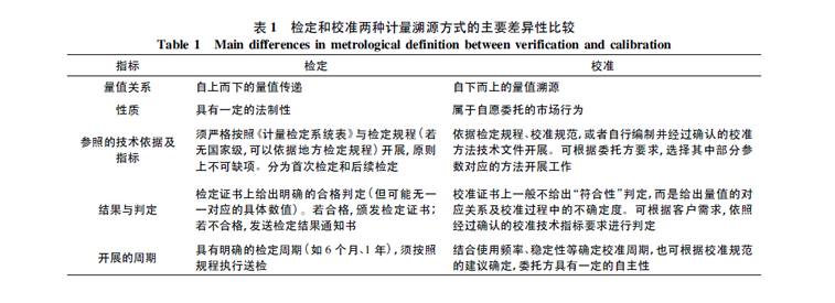 计量器具常规量值溯源的方式包括检定和校准表1比较了两者的主要差异点。检定是指为评定计量器具是否符合法定要求,确定其是否合格而进行的全部工作。检定分为强制检定与非强制检定,其中,强制检定的对象分为计量标准和工作计量器具两类,第三方检测机构往往重视第二类而忽视第一类。计量标准分为社会公用计量标准、部门建立的最高计量标准及机构自行建立的最高计量标准。社会公用计量标准及部门建立的最高计量标准一般是由国家法定计量检定机构(如中国计量科学研究院、北京市计量检测科学研究院)及国家部门计量技术机构(如原铁道部下属的计量中心、国家气象局下属的计量实验室)建立,第三方检测机构通常仅涉及企事业单位内部最高计量标准。例如,某环境监测站对部分使用频率较高的空气采样仪器建立了用于自校、期间核查的流量标准装置(由皂膜流量计、压力计乃秒表等组成)该装置构成该站内部关干流量的最高计量标准,须纳入强制检定管理体系。工作计量器具则是指单独或与一个或多个辅助设备组合。用于进行测量的设备可以理解为一般的、非用以建立计量标准的计量器具,如实验室通用的砝码、容量瓶、红外油分仪、紫外分光光度计。化学需氧量分析仪等。