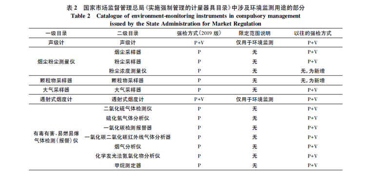 根据2018年修正的《中华人民共和国计量法》及《中华人民共和国计量法实施细则》强制检定的范围为列入《中华人民共和国强制检定的工作计量器具明细目录》(以下简称《明细目录》)日用干贸易结算、安全防护、医疗卫生、环境监测领域的工作计量器具。2019年10月,国家市场监督管理总局发布了《实施强制管理的计量器具目录》(以下简称《目录》),首次采用了“P”(型式批准)和“P+V”(型式批准+强制检定)的管理办法。相较于较早版本的《明细目录》新《目录》大幅减少了强制检定的工作计量器具类别。如表2所示。对于明确或者可能涉及环境监测用途的工作计量器具,基本以强制型式批准方式为主,规定须强制检定的工作计量器具仅包括声级计、透射式烟度计,而诸如环境检测实验室通用的砝码、天平和分光光度计等仪器均已不再列入《目录》。同时,结合技术发展情况与需求,新增了颗粒物采样器及粉尘浓度仪。列入强制管理范畴。对于采用“P+V”管理模式的工作计量器具,必须按照规程要求定时定点送至指定的法定计量检定机构进行周期检定,如当地计量检定机构无资质,可送至上级检定机构:对干采用。”管理模式的器具则可由机构自主决定在量值管理中采用检定(非强制)或校准的溯源方式。