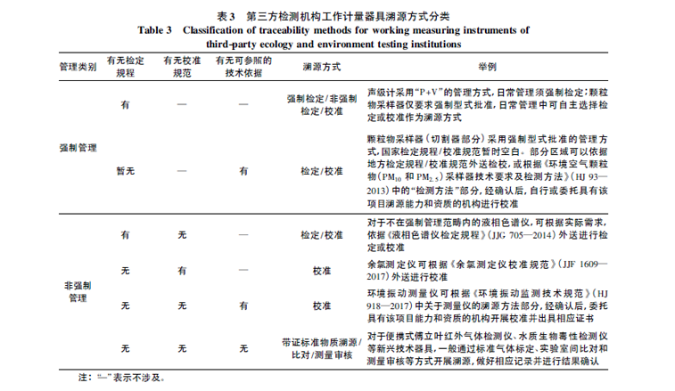 未列入强制管理目录的工作计量器具并非不需要进行量值溯源日。相反地,客观上对第三方检测机构质量管理的有效运行提出了更高要求第三方检测机构须结合实际使用情况确定量值溯源的方式。表3根据不同的管理方式罗列了技术依据存在与否的情况下,第三方检测机构应采取的工作计量器具溯源方式。仪器保管与质量管理人员应先确定器具的法制管理要求,对于非强制管理的部分。查询是否存在相应的检定规程或校准规范,一般可通过检定(非强制)或校准等方式进行量值溯源。在实际工作中,由于环境领域新技术的快速发展和应用,计量技术法规尚未健全。对于检定规程、校准规范和其他技术依据均空白的计量器具,建议优先参考使用近似原理和类型的仪器的规程/规范开展校准,也可以通过标准物质赋值、实验室间比对或测量审核等方式开展相应的量值管理工作,形成质量管理闭环。