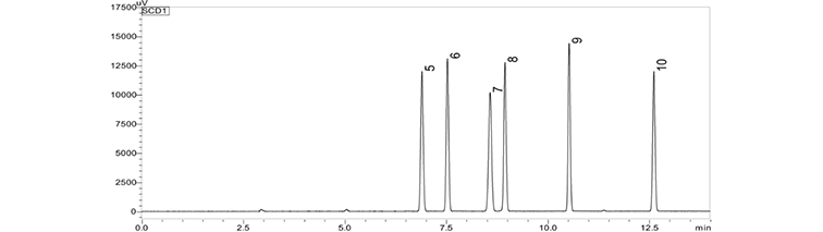 使用Nexis GC-2030(搭配SCD-2030检测器)管路系统惰性化,直接进样测定氢气中硫化氢、羰基硫、甲硫醇、乙硫醇、甲硫醚、二硫化碳、叔丁硫醇、甲基乙基硫醚、乙硫醚、四氢噻吩等组分。