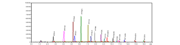 图1. 17种全氟化合物MRM色谱图(1 ng/mL)