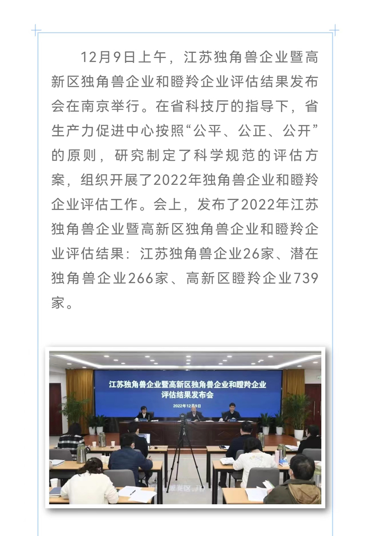 江苏独角兽企业暨高新区独角兽企业和瞪羚企业评估结果发布
