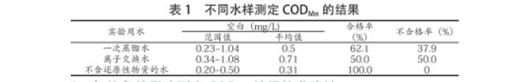 我国现行标准条例(GB/T5750-2006)中,记录的检测饮用水的方法很多,其CODMn测定利用的原理是:将硫酸加入水样之中使水样能够呈现出酸性,并向其中加入一定容量的高锰酸钾溶液,然后将混合溶液放在沸水浴环境中加热一定时间使其进行反应,接下来再通过过量的草酸钠溶液将混合液中残留的高锰酸钾成分全部还原,最后将与水样发生反应的高锰酸钾的数量计算出来,即可得出高锰酸盐指数,使用该方法测定CODMn时要求待测定的水样中,不得含有其他,关于这一点有实验数据为证。