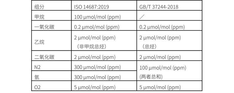 表1. 燃料电池汽车用氢燃料的国际和国内标准中的质控指标举例