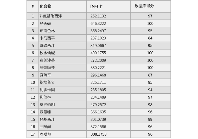 表2展示了人全血样品中添加17种药物化合物样品的数据库比对结果分数。所有添加物的比对分数均在84至100间,这表明原位探针离子化方式可在3分钟内,简化样品制备方式并得到高速质谱检测条件下的优质检测结果。