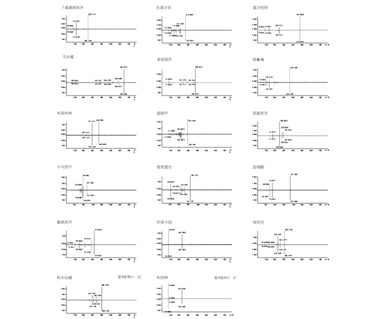 使用配备DPiMS QT离子源的LCMS-9030高分辨飞行时间液质联用仪可实现17种有毒物质在人全血样品中的快速筛查并获得良好的数据库比对结果,数据库比对分数在84到100。