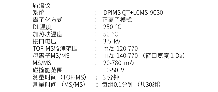 采用配备DPiMS QT离子源的 LCMS-9030质谱系统,可兼容并使用ESI-QTOFMS各类药物,毒物方法包的目标。仅需将采集到的数据和预先加载的数据库进行比对即可。表 1 列举了MS分析条件。