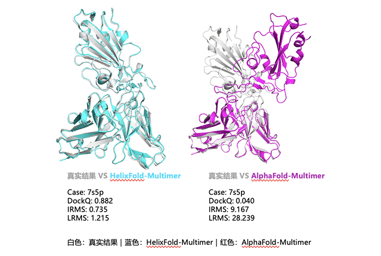 这一算法还被应用于业界公认的抗原抗体匹配的任务中,为新冠病毒的刺突蛋白准确预测了抗原抗体对接面,预测的复合体构象与真实实验值的重合度高于主流蛋白结构预测模型(见下图)。