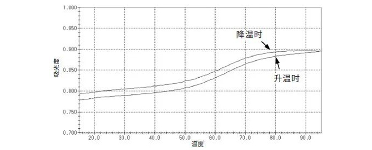 测试样品为M13-25mer核酸,测试前先进行样品溶液脱气的预处理,通过UV-1900i和Tm分析系统可以轻松获得Tm 曲线(绘制260nm处的吸光度对温度曲线,如下图所示),该曲线可以显示升温时和降温时的结果。