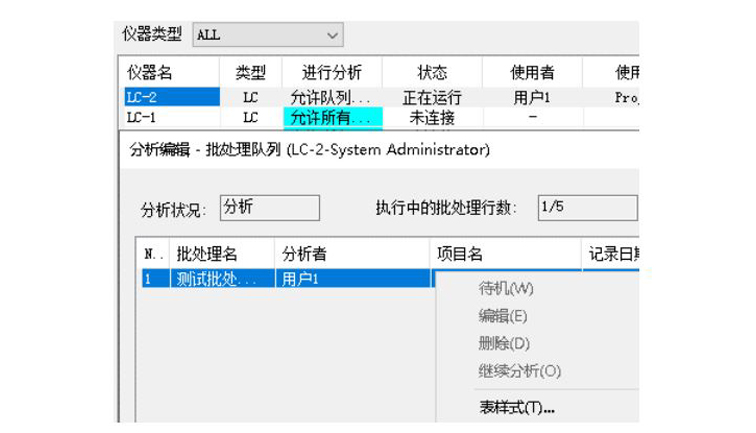 2、使用对应账户登录,选择相应项目,打开此仪器,看是否可以正常登录,如还是无法登录,则右击对应仪器,选择“批处理队列”,在显示的批处理队列中删除所有批处理队列后,再尝试连接仪器。